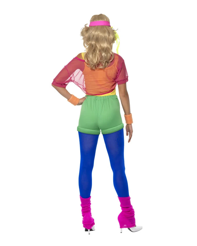 Das Aerobic Outfit besteht aus einem pinken Netzoberteil mit gelben Body und den giftgrünen knappen Hot Pants. Das legendäre Stirnband als Schwitzschutz ist im Lieferumfang enthalten. Besorg dir zusätzlich noch Leggins und die Stulpen Neonorange und schon bist du die Aerobic Queen in deinem Fitnesscenter.