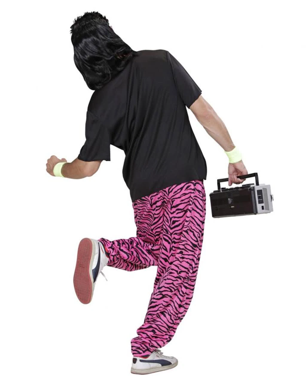 Das 80er Jahre Männer Kostüm besteht aus einer pink-schwarzen Jogginghose im Zebra-Muster sowie einem schwarzen T-Shirt mit der bunten Aufschrift „i love the 80´s“ sowie einer roten Rocker-Lippe mit Zunge. Kombiniere noch die Vokuhila Herren Perücke schwarz, den Bart Albert Einstein schwarz & die Atzen Brille Neonpink & du bist der Disco Prinz der Karnevalsparty!