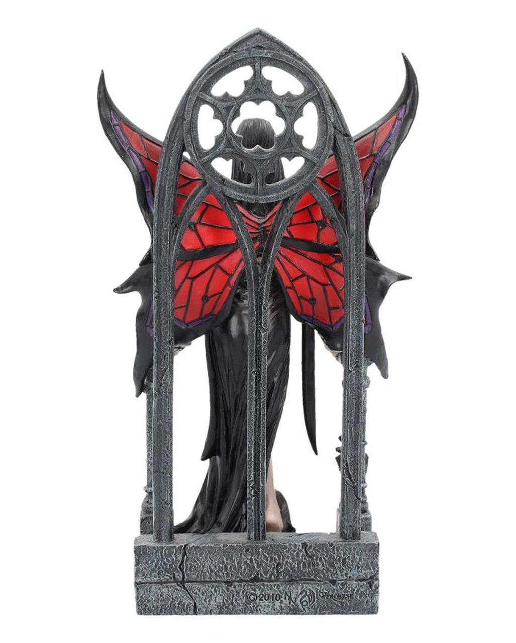 Die bezaubernde Aracnafaria Gothic Fee Figur aus der Gothic Geschenkartikel-Kollektion entstammt der gotischen Fantasie der talentierten Künstlerin Anne Stokes. In einem langen schwarzen Kleid steht diese dunkle Fee barfuß auf dem Boden einer Kirche zwischen zwei grauen Steinpfosten. Hinter ihre anmutigen und düsteren Erscheinung erhebt sich der gotische Bogen eines Kirchenfensters. Sie schaut dich intensiv an, hypnotisch fast. Ihre schwarz-roten Flügel sind hinter ihr ausgebreitet und mit einem Spinnennetzmuster versehen, passend zu dem schwarz-roten Spinnenanhänger, den sie trägt.