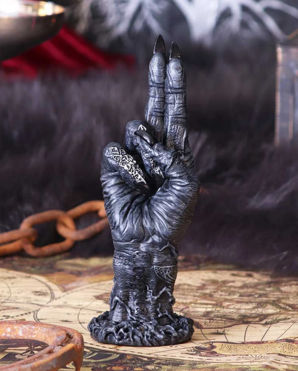 Aus dem Nichts erhebt sich die schwarze Baphomet-Hand, zwei Finger empor gerichtet. Es macht den Eindruck, als würde die Hand langsam zerfallen, was die Symbolik der Vergänglichkeit gekonnt aufgreift. Silberne Worte und Symbole vollenden diesen mystischen Look und entfalten ihre Macht, während du zu Baphomet betest. Sichere dir Baphomet´s Prophecy Hand als okkulte Deko für deinen Hausaltar. Der dekorative Hingucker verleiht deinen Räumlichkeiten ein mystisches Flair und integriert sich perfekt in den alternativen Haushalt.
