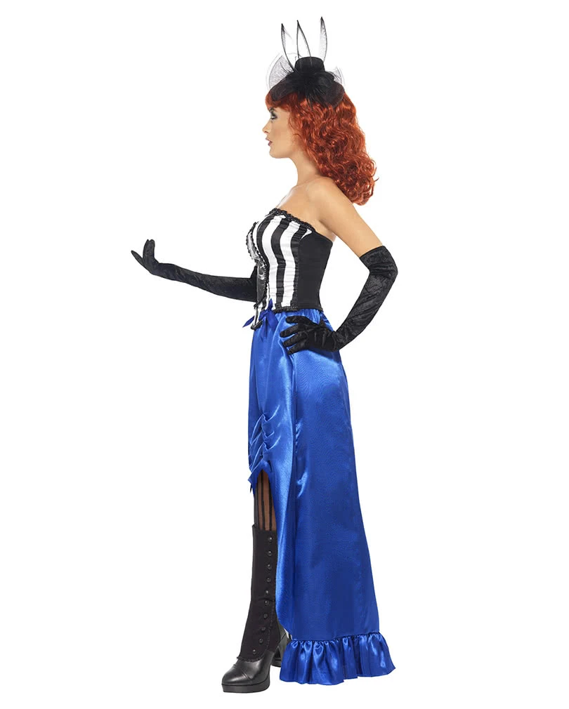 Das Burlesque Kostüm besteht aus einem Kleid und einer angenähten Corsage. Schuhe, Strumpfhose, Handschuhe sowie Hut sind nicht im Lieferumfang enthalten. Die Corsage hat auf der Vorderseite schwarze-weiße Längsstreifen und an den Rändern eine schwarze Zierborte. Als weiteres Detail sind noch 2 kleine blaue Satin-Schleifen an der Corsage angebracht. Im Brustbereich sieht es so aus, als wäre ein Loch im Körper wodurch man als Röntgenbild die Rippen der Trägerin sieht. Der Rock ist in blauem Satin und geht direkt von der Corsage aus nach unten. Der Innenstoff ist ebenfalls in schwarz-weißen Längsstreifen, die teilweise zu sehen sind. Die Vorderseite des Rockes ist bis zum Knie nach oben gerafft. Die Raffung wird mit 2 blauen Schleifen gehalten. Dadurch sieht man den schwarz-weißen Innenstoff.