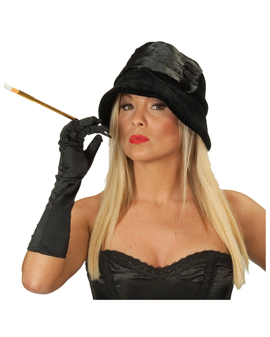 Der schwarze Charleston Hut ist mit weichem Samt überzogen sowie mit drei großen Knöpfen besetzt. Passende Kostüm Accessoires zu diesem Charleston Damenhut sind beispielsweise der elegante ausziehbarer Zigarettenhalter sowie Schwarze, ellbogenlange Samthandschuhe, die dein Charleston Outfit optisch aufwerten und authentischer wirken lassen. Mit sexy Augen Make Up und Kostümzubehör wie diesem eleganten Hut wirst du auf jedem Kostümfest zum Blickfang, denn 1920er Verkleidungen sind immer wieder gern gesehen.