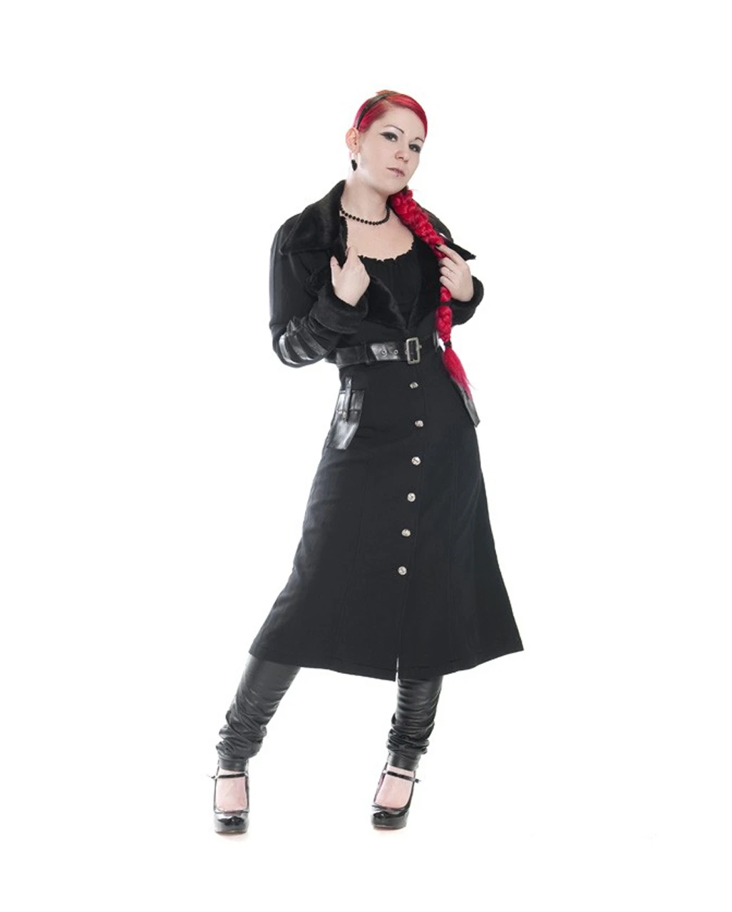 Der Damenmantel mit Kunstfellkragen Schwarz ist ein Gothic Fashion Must-have für den besonderen Geschmack. Der schwarze Mantel betont deine Silhouette mittels elegantem Kunstleder Gürtel auf stilvolle Weise und setzt dich mit detaillierten Applikationen gekonnt in Szene. Ein besonderer Blickfang ist natürlich der weiche Fake-Fur Kragen, welcher diesem schönen Damenmantel eine mondäne Note verleiht. Kunstleder Akzente an den Ärmeln und Knöpfe mit Totenkopf Motiv machen den langen Gothic-Mantel zu einem exclusiven Mode-Accessoire, das in keinem Kleiderschrank fehlen darf. Der Damenmantel mit Kunstfellkragen Schwarz ist in den Größen S-XL verfügbar und lässt sich durch seinen kuschelig-weichen Stoff sehr angenehm tragen. Entdecke noch mehr Gothic-Mode online, wie den verspielten Gothic Mantel Mace mit Kapuze