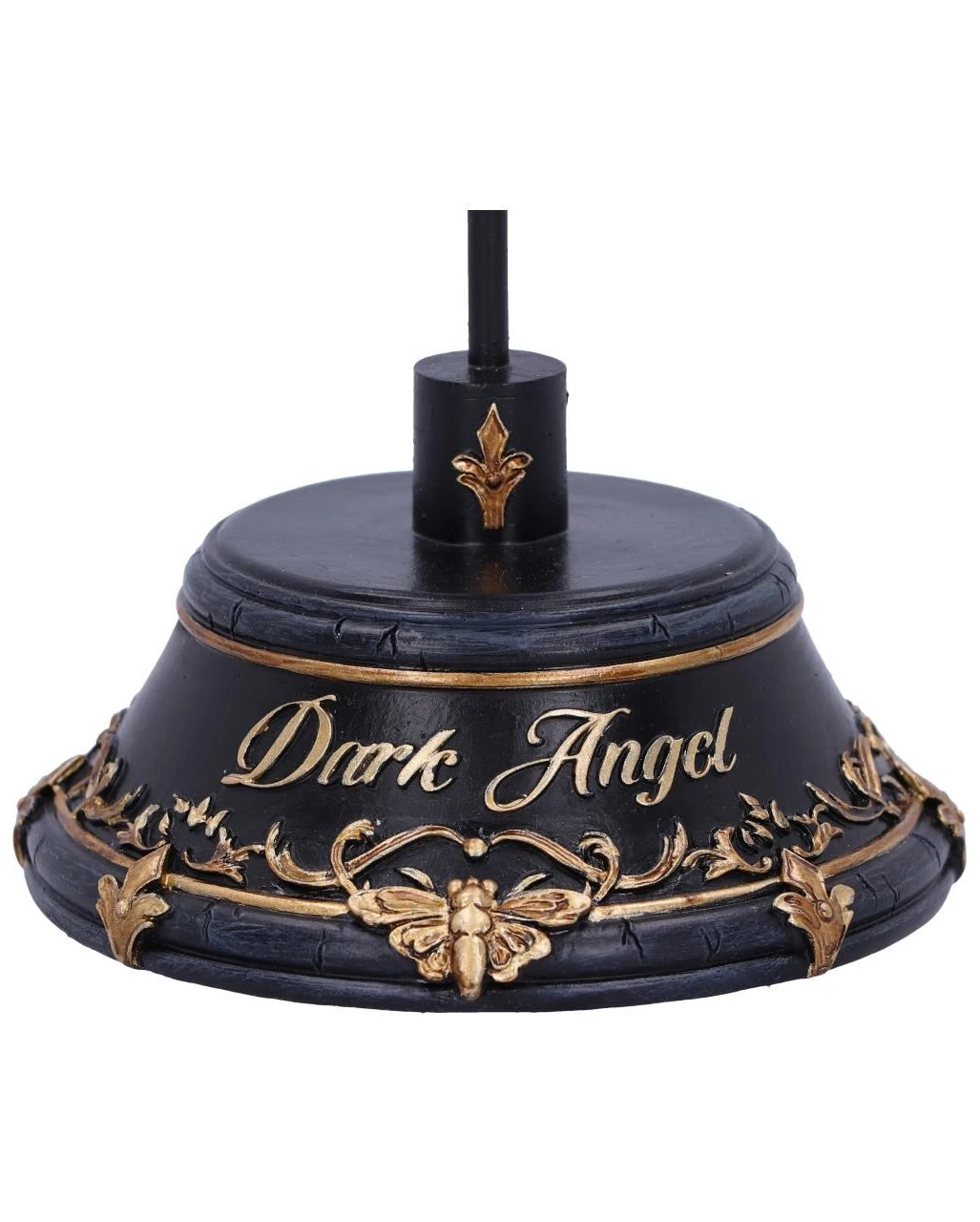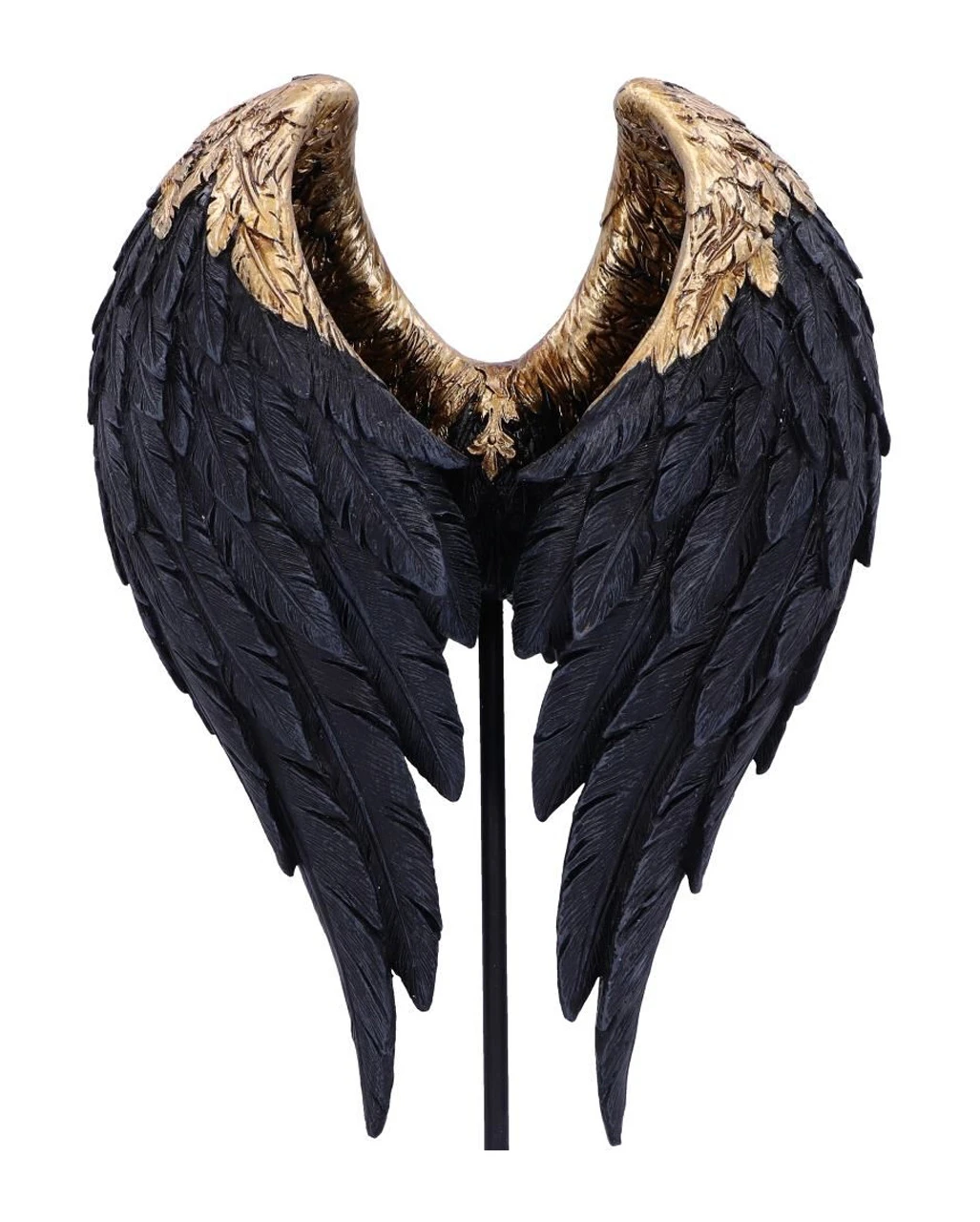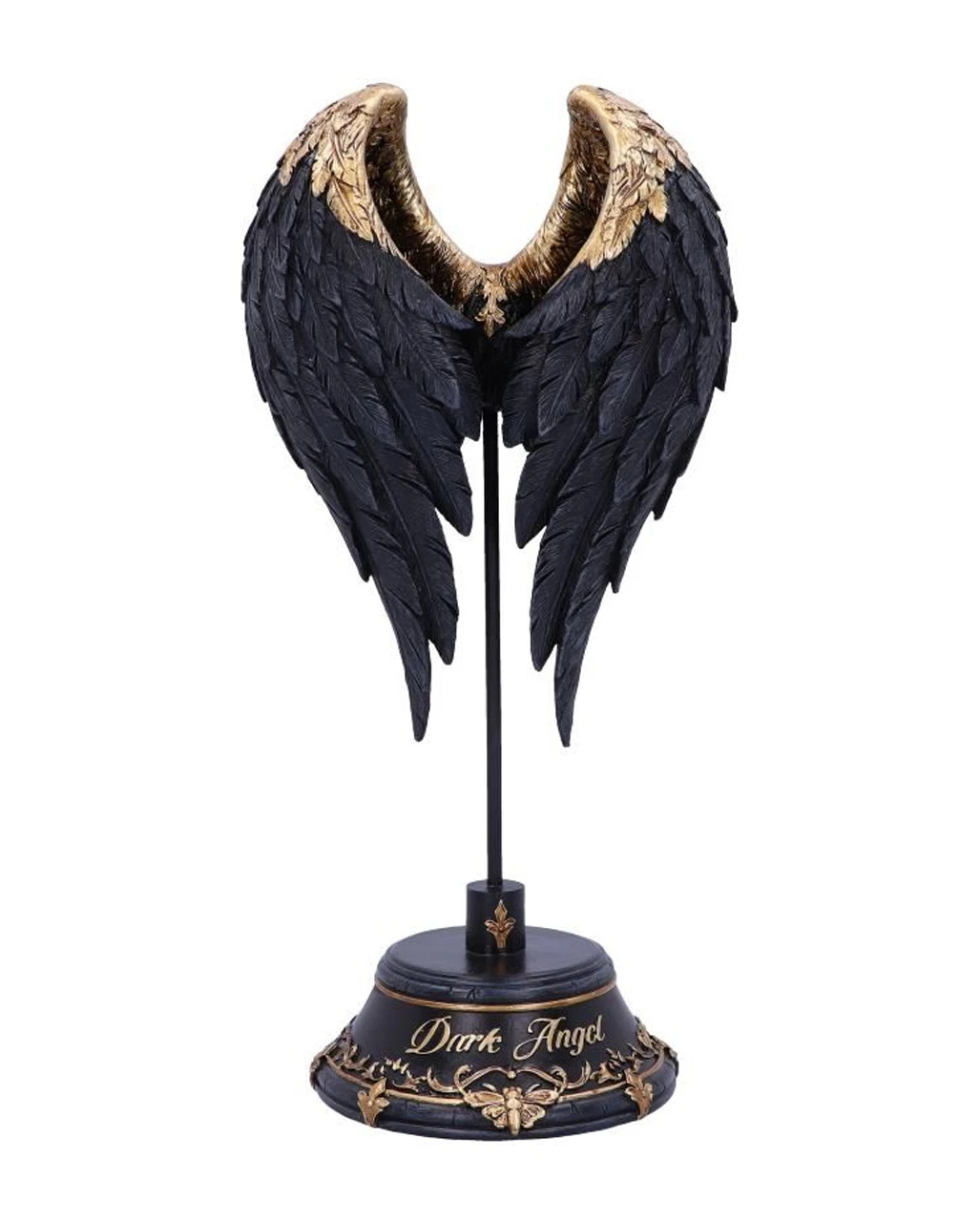 Elegante, schwarze Engelsflügel, erheben sich von einem goldenen, detaillierten, schwarzen Sockel mit der goldenen Aufschrift „Dark Angel“. Die Flügel des schwarzen Engels, wölben sich umeinander und schützen so die Dunkelheit im Inneren. Außergewöhnlich und geheimnisvoll verströmt die Figur eine andächtige Aura und verleiht deinem Wohnraum ein wenig gotischen Charme.