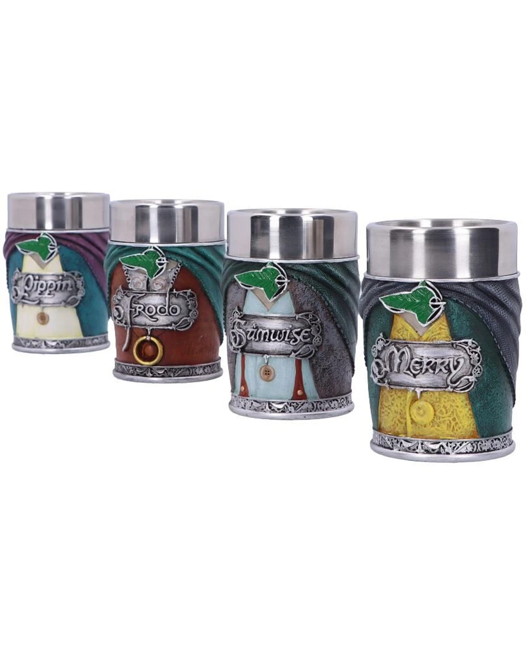 4 Schnapsgläser mit den ikonischen Kleidungsstücken der vier Hobbits