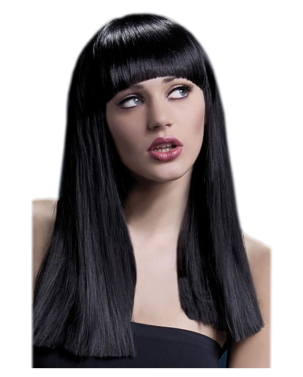 DIe schwarze Damen Perücke Alexia besteht aus glattem, geradem Kunsthaar und weist eine Länge von 48cm auf. Bis zu einer Temperatur von 120°C lässt sich die scheitellose Perücke mit Glätteisen, Lockenstab und Fön frisieren. Der modische gerade Schnitt des Ponys lädt zu einem aufwändigeren Augen Make Up ein. DIe Reinigung per Hand ist unkompliziert und durch das innen eingearbeitete Haarnetz wird ein hoher Tragekomfort der Fever Damenperücke Alexia erreicht. Dazu passend wäre z.B.ein Roter Lippenstift und das Monroe Corsagenkleid schwarz.
