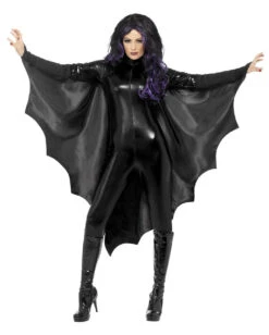 Die schwarzen Fledermaus Flügel aus glänzendem Stoff haben zwei Ärmel zum reinschlüpfen und einen hohen Kragen, der mit einem Klettverschluss um den Hals verschlossen wird. Kombiniere die schwarzen Flügel mit dem Sexy Catsuit Schwarz und den Scarecrow Vampir Eckzähne chromfarben und sei so perfekt ausgerüstet für die nächste Halloween Party.