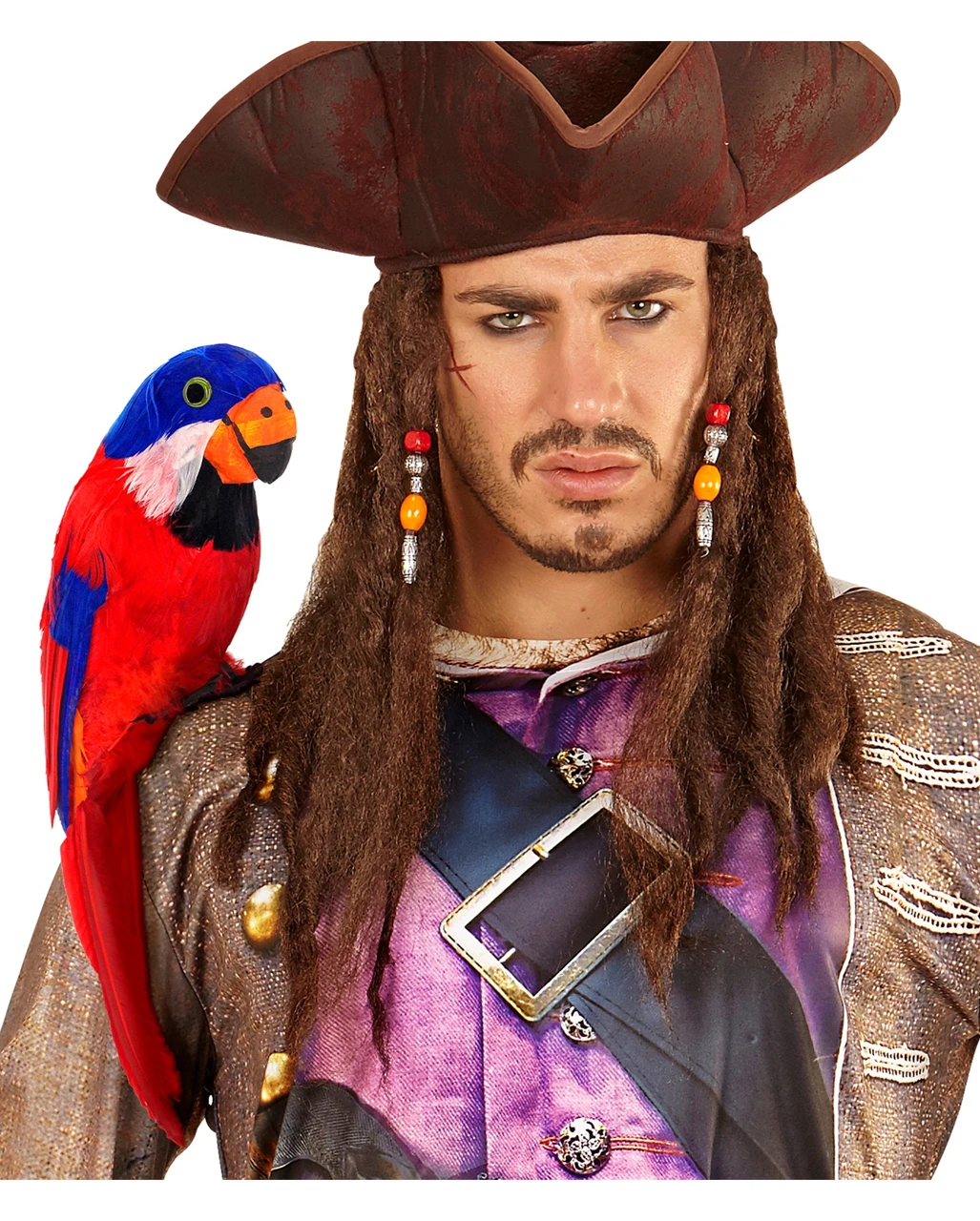 Der Papagei mit roten und blauen echten Federn wird mit einem schwarzen Band auf der Schulter befestigt und ist damit ein wahres Prachtexemplar von Tropenvogel. Die besten Piratenfilme aus Hollywood bekommen mit Dir als Pirat durch dein Kostüm mit einem bunt gefiederten Papagei echte Konkurrenz. Der ca. 23 cm große Papagei besitzt bunte Federn und lässt sich prima als Kostümzubehör oder Beachparty-Dekoration einsetzen.
