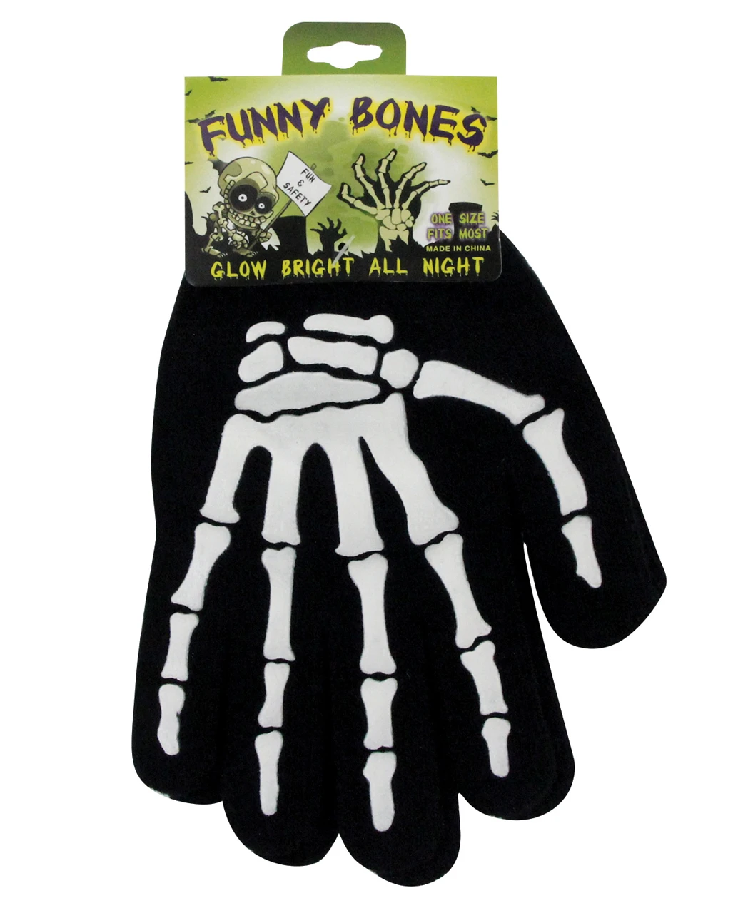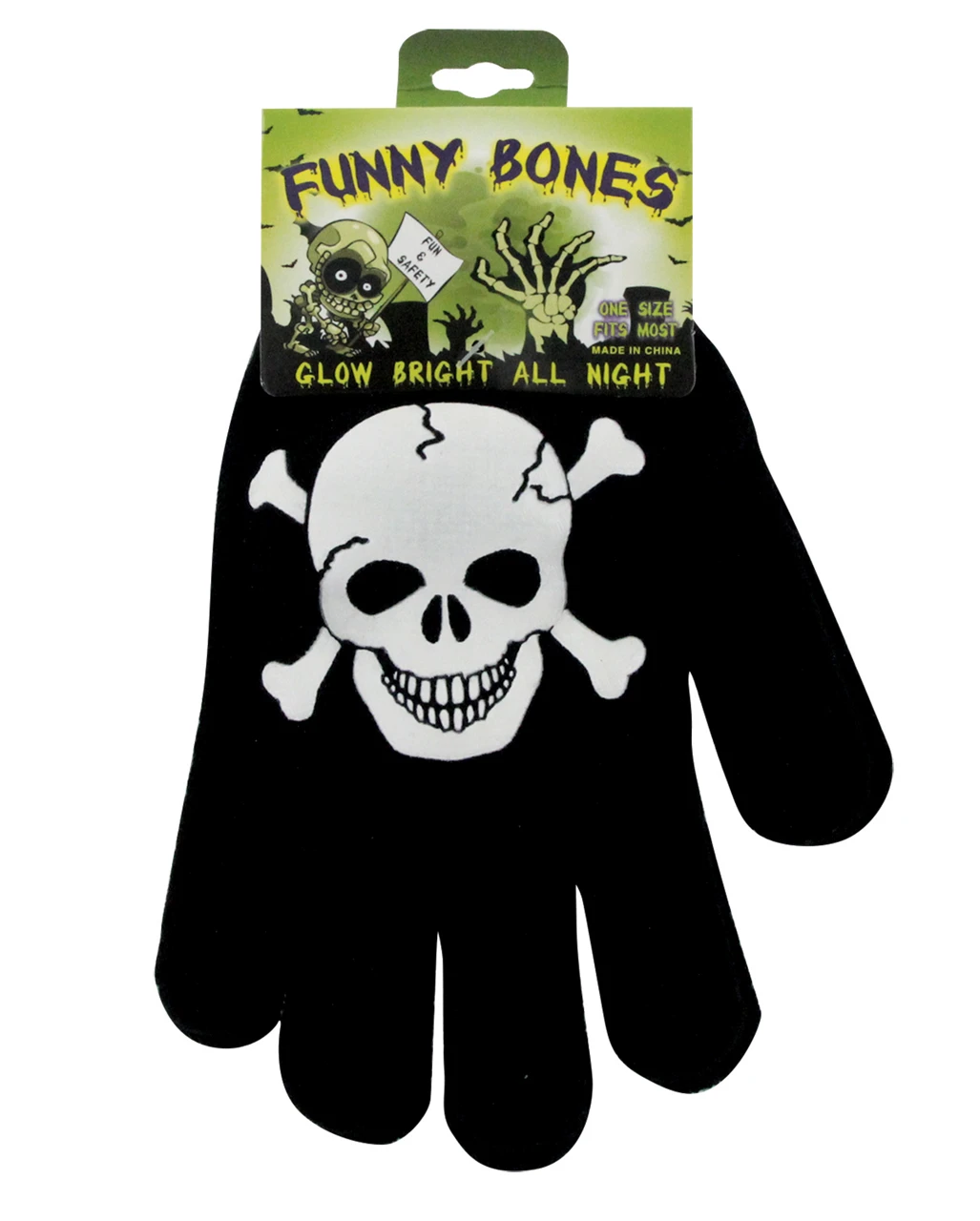 Schwarze Handschuhe mit Knochenhand oder Totenschädel, die im Dunklen leuchten