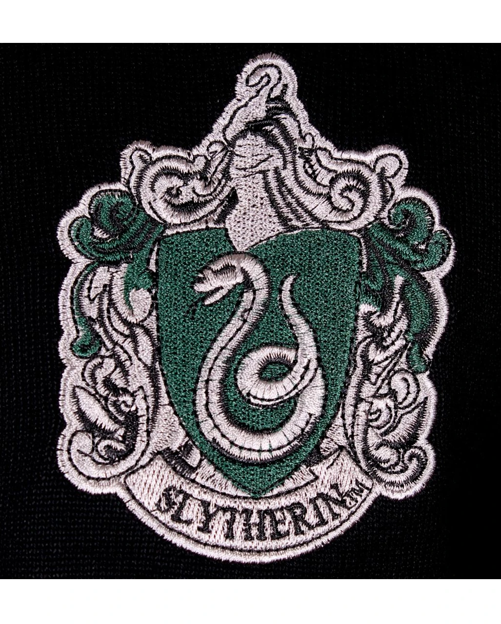 Der schick aussehende Harry Potter Slytherin Pullover schwarz besteht zu 55% aus Polyacryl und zu 45% aus Baumwolle, was ihn angenehm tragbar macht. Du kannst Ihn sogar bei 30% in die Waschmaschine stecken, damit seine schöne schwarze Farbe und die Verzierung wieder gut zur Geltung kommt. Die typischen Farben Grün und Grau, die das Wappen dominieren, finden sich auch als Streifen im Hüftbereich und an den Ärmeln wieder. Das Wappen selbst prangt gut sichtbar im Brustbereich. Viele weitere Harry Potter Fanartikel findest Du bei uns im Shop. Wie wäre es zum Beispiel passend zum Pullover mit einem Harry Potter Slytherin Strickschal?