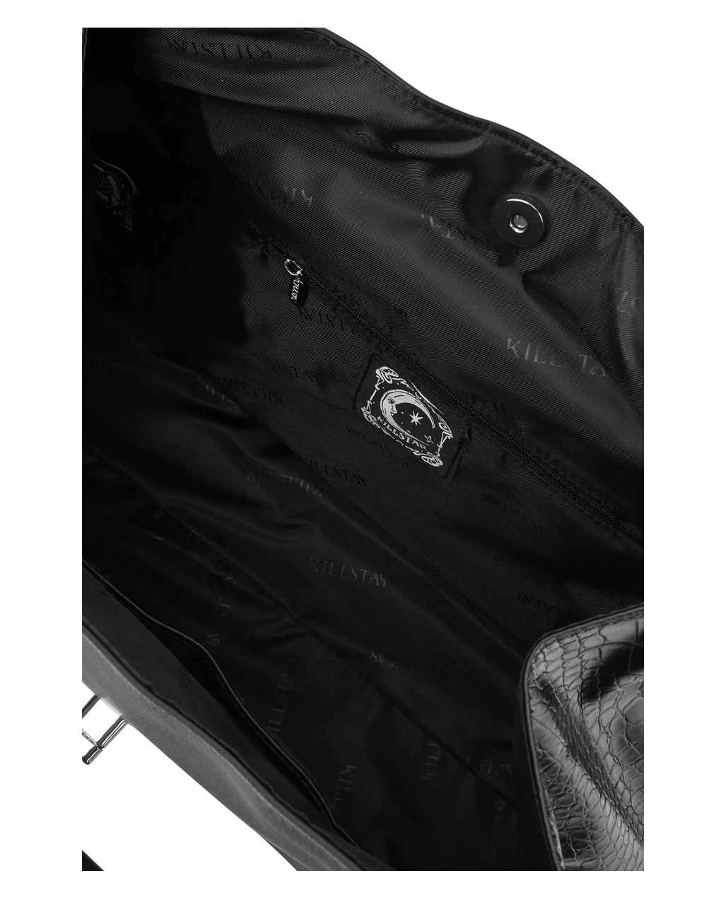 Du bist die pure Versuchung. Niemand kann dir und deinem düsteren Styling widerstehen, aber manche wagen es kaum, dich anzusprechen. Dein Look ist einfach zu geheimnisvoll. Die KILLSTAR Black Widow Schultertasche hängt lässig an deinem Arm. Aber was ist darin verborgen. Ein Messer? Ein Fläschchen mit tödlichem Gift? Oder bloß ein Gedichtband von Sylvia Plath? Wer weiß schon, das du in deinem fein abgestimmten Gothic Outfit im Schilde führst.