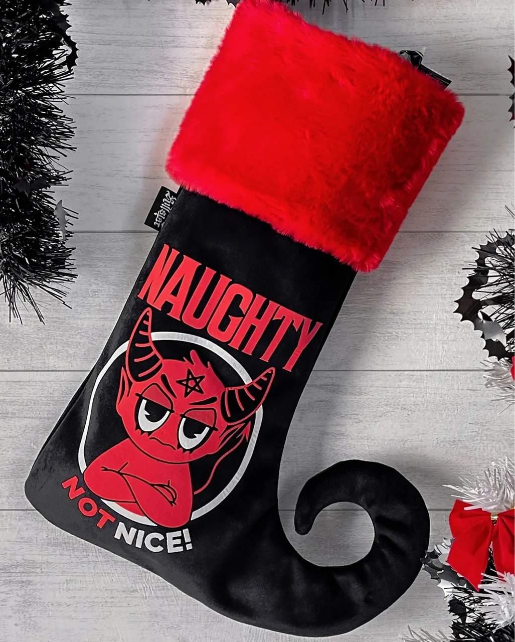 Der KILLSTAR Naughty Hexmas Strumpf ist der ideale Weihnachtsstrumpf für dein alternativ dekoriertes Weihnachtsfest. Bei euch ist es herrlich düster und die Fledermäuse trinken mit den Spinnen zusammen Glühwein unterm Weihnachtsbaum. Keine Frage, dass sich der Strumpf mit dem frechen Teufel Motiv perfekt in deine Gothic Weihnachtsdeko einfügt.