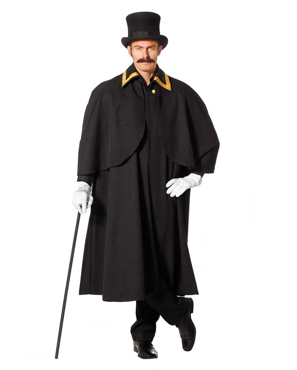 Der schwarze Kostüm Kutschermantel weist ein edles Design auf. Großzügig geschnitten und mit der charakteristischen Pelerine versehen, sorgt die goldene Ziernaht am Kragen des Kutscher-Umhangs für einen eleganten Look. Durch die schlichte Farbgebung fügt sich der Kostüm-Mantel perfekt in jede Verkleidung für Halloween ein und vollendet deine Kostümierung bei WGT, MPS und LARP-Events. Dazu passen ein Schwarzer Zylinder und die Weiße Kostüm Handschuhe Unisex.