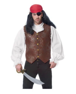 Die Kostümweste im Antik-Look ist aus braunem Stoff in abgewetzter Lederoptik gefertigt. Die eindrucksvolle Weste reicht bis zur Taille und verfügt über einen V-Ausschnitt, der dir erlaubt, darunter die verschiedensten Hemden zu tragen.