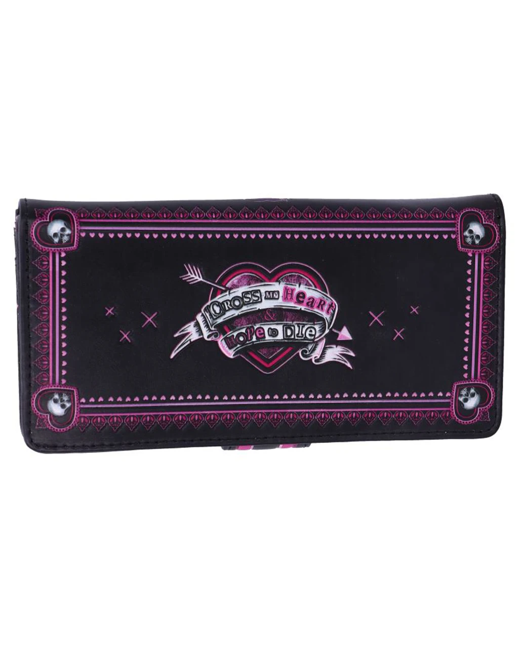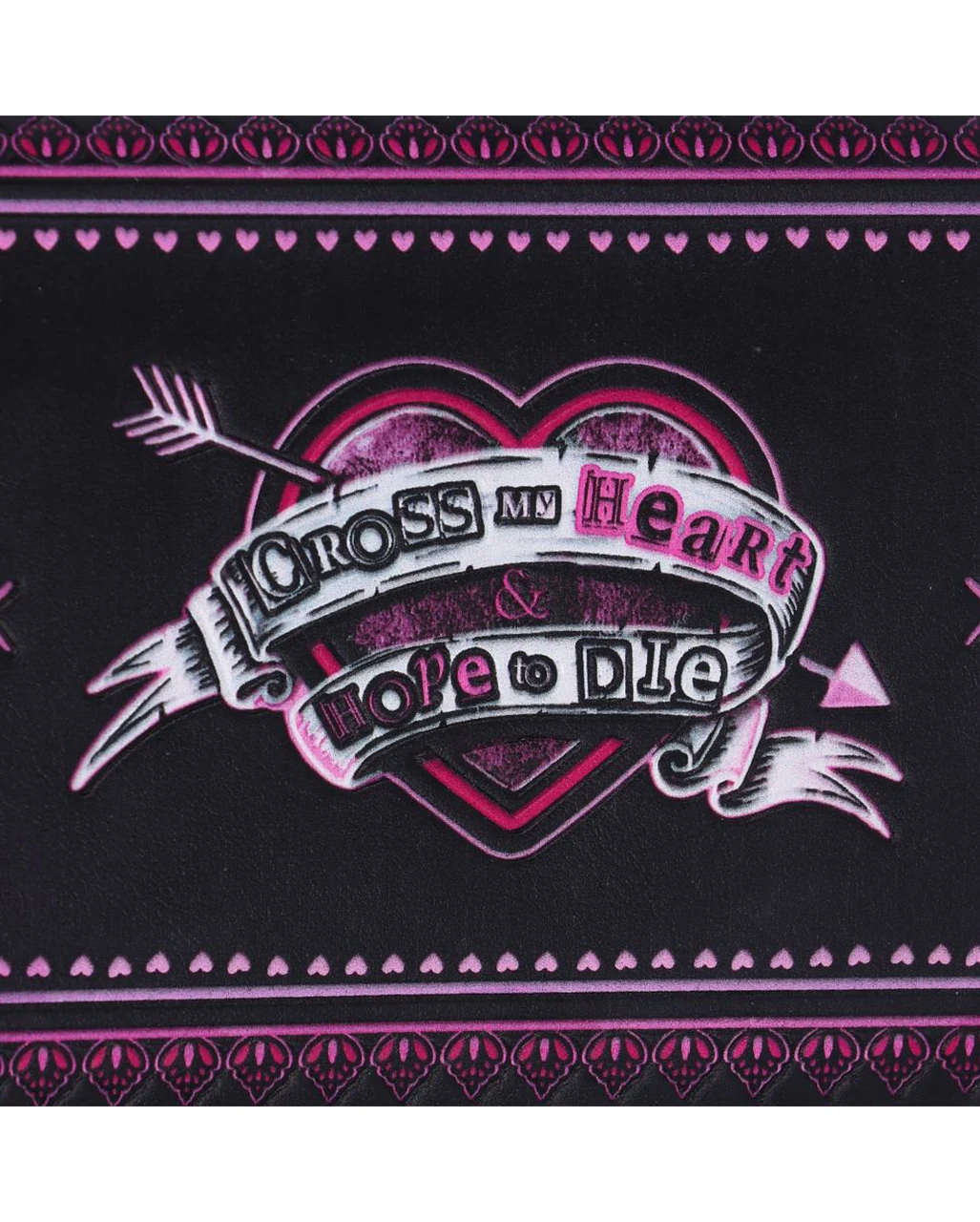 Unsere Little Monster Harley Quinn Geldbörse ist 18,5 cm groß und in den Farben Schwarz, Pink und Weiß designt. Die von Superschurkin Harley Quinn inspirierte Aufmachung fällt direkt ins Auge. Auf der Rückseite des geprägten Little Monster Portemonnaies ist ein Dolchherz mit den Worten „Cross My Heart Hope To Die“ abgebildet. Mehrere Fächer bieten Platz für Bargeld und Karten. Mit diesem schicken Gothic Accessoire ist dein ganzes Geld sicher aufbewahrt. Auch unseren Little Monster Totenschädel solltest du dir nicht entgehen lassen.