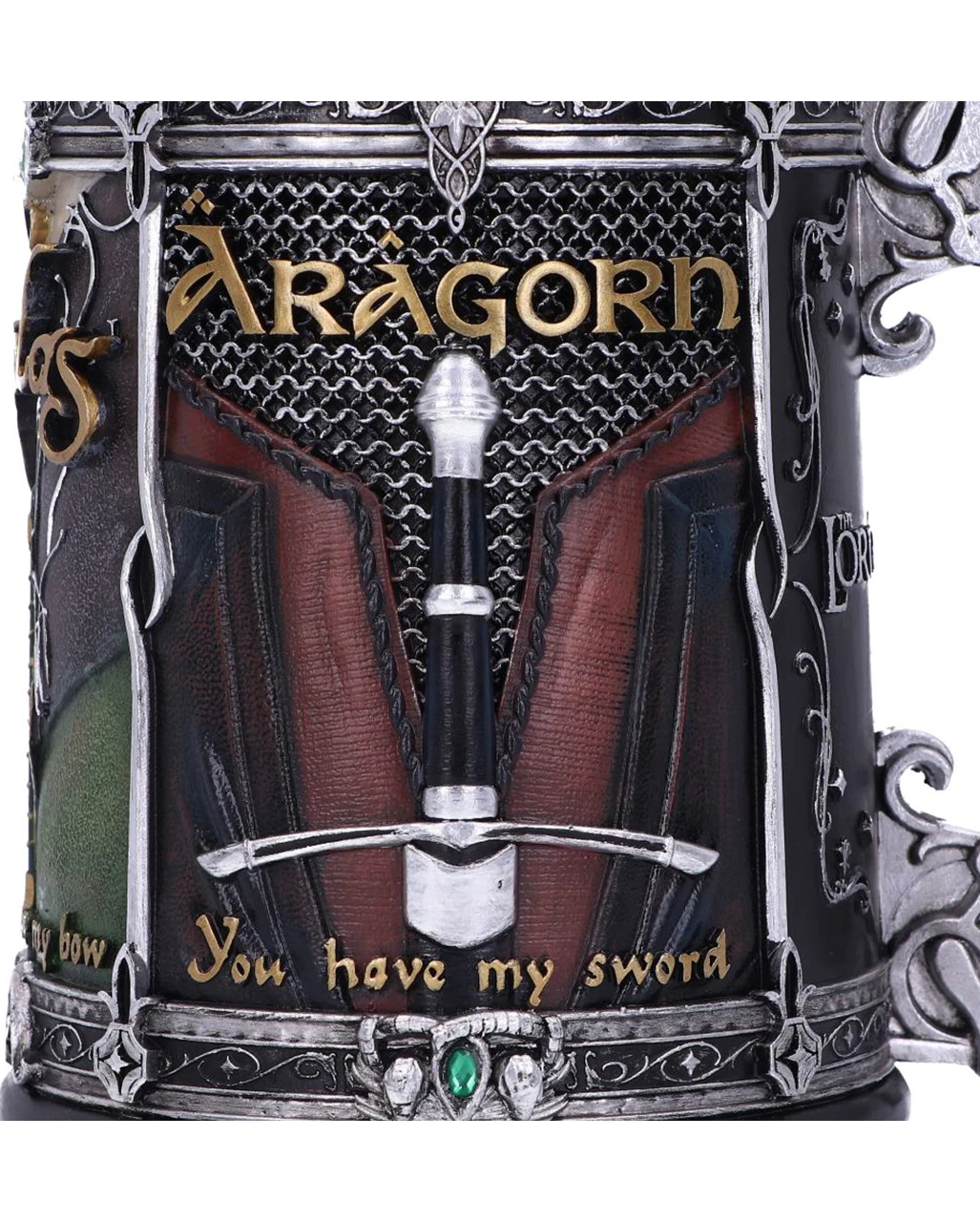 Besitze jetzt den offiziell, lizenzierten Lord of the Rings Fellowship Krug, der als Motiv die kultigen Kleidungsstücke und Waffe der Wahl von Gimli, Legolas und Aragon als Motiv sein Eigen nennt. Auf jedem Motiv der Krieger ist der entsprechende Name abgebildet. Dieser Freundschaftskrug ist die perfekte Art, die drei Jäger zu feiern, während du dein Lieblingsgetränk genießt. Auf dem Henkel des hochwertigen Bierkruges ist das ikonische Blatt von Lorien inmitten der Ranken zu sehen, die sich um ihn winden.