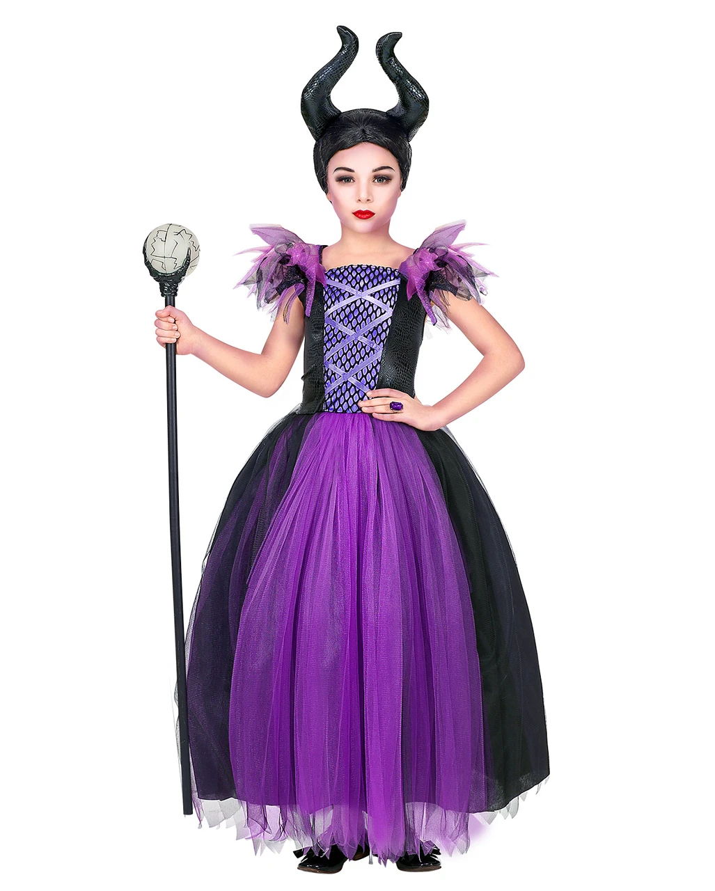 Das Malefizia Kinderkostüm mit Kopfschmuck ist eine fantastische Halloween Verkleidung für Mädchen. Unser Dunkle Königin Kostüm ist mit einem weiten Rocksaum und Tüll-Details ausgestattet – ganz so, wie es eurer Majestät beliebt. Als Krönung dient ein schwarzer Hörner Kopfschmuck, der ihre Macht unterstreicht und sie besonders boshaft aussehen lässt.