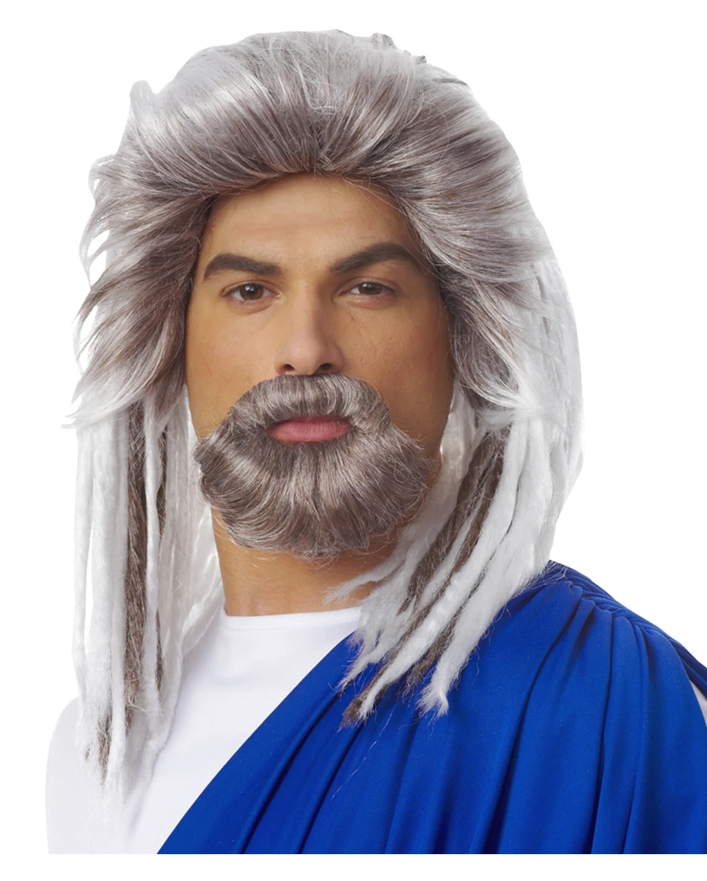 Die Meereskönig Perücke mit Bart entspricht optisch bis ins Detail den bekannten Darstellungen aus zahlreichen Filmen und Bildern des Gottes der Meere. Eine stürmische, sorgsam nach hinten gekämmte grau-weiße Mähne aus Kunsthaar erzeugt den charakteristischen Look Poseidons, während der ebenfalls grau-weiße und adrett gestutzte Kostüm-Bart das ehrwürdige Aussehen einer Gottheit unterstreicht. Eingeflochtene Dreadlocks schmücken deine Faschings-Frisur zusätzlich. Dazu empfehlen wir die Römer Sandalen mit Schnürung braun und die Königskrone mit Schmucksteinen.