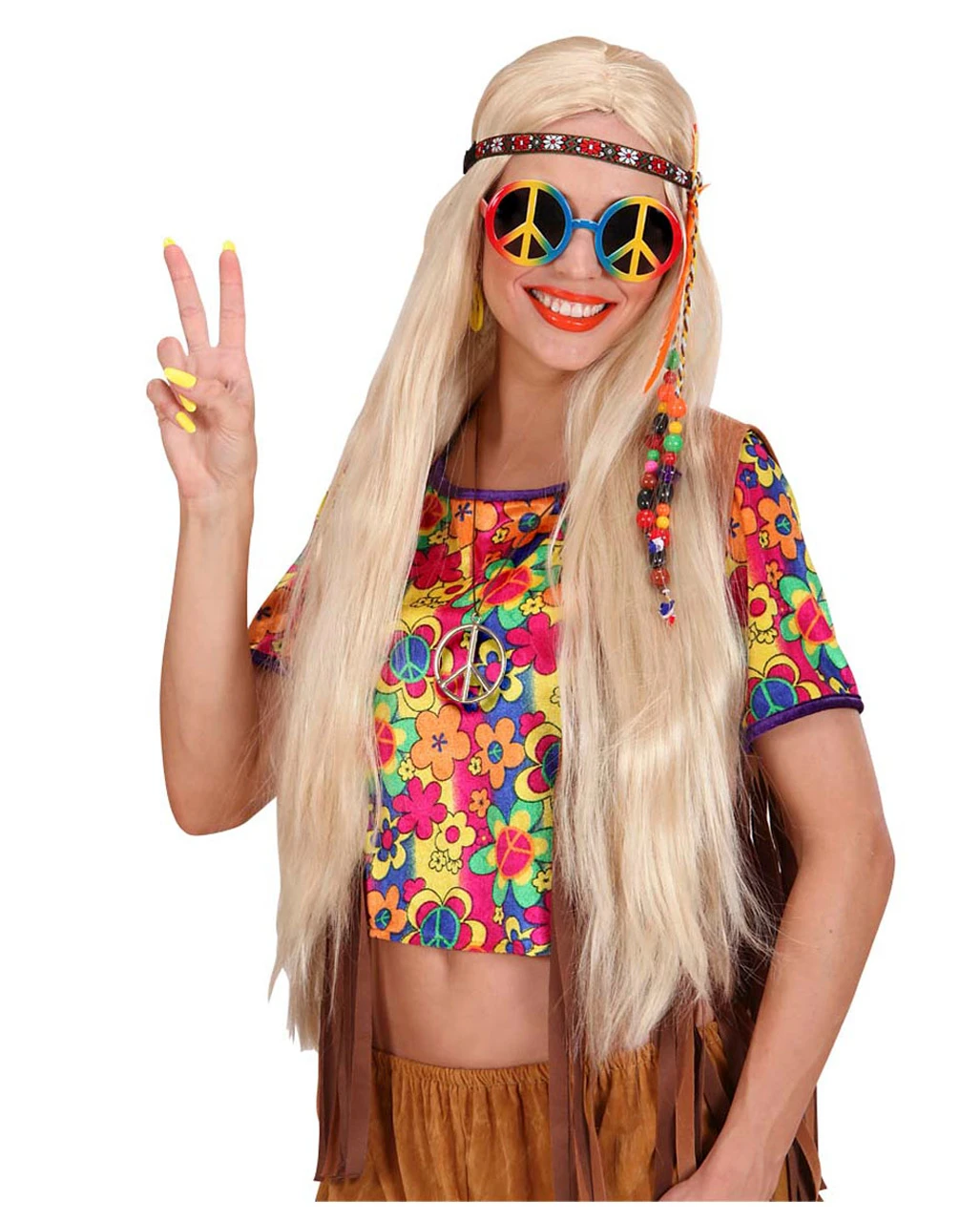 Die Peace Symbol Anhänger hat einen Durchmesser von etwa 6 cm und hängt an einer gewachsten Schnur von etwa 90cm. Kombiniere die coole Hippi Kette doch noch mit einer Afro perücke oder unserer Langhaar Hippie Perücke blond und schon tauchst du ein in die Welt von Janis Joplin und Bob Marley.