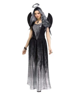 Ob Todesengel Verkleidung oder liebliches Halloweenkostüm der besonderen Art, unser Onyx Engel Damen Kostüm ist wie geschaffen für deine dunkle Seele. Das wunderschöne Kostümkleid zaubert durch sein Dreieck aus silbernem Glitzerstoff eine besonders hübsche Taille. Das lange fließende Kleid sorgt durch seine Übergänge von Schwarz ins Silbergraue für eine elegant-düstere Erscheinung. Die schwarzen Flügel und der silberne Heiligenschein komplettieren das Kostüm-Set des dunklen Engels.