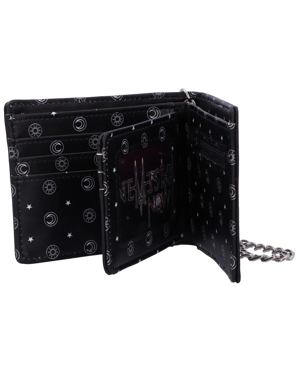 Geisterbretter sind seit langem eines der mächtigsten okkulten Werkzeuge, die es gibt. Eingefasst mit komplizierten barocken Mustern, ist der Hintergrund schwarz und hat das Alphabet in einem Bogen aufgedruckt. Auf jeder Seite von „Goodbye“ zeigen zwei verschnörkelte Planchetten in die Mitte, als ob sie bereit wären, sich zu bewegen. Das Design der Ouija Geldbörse beinhaltet auch die Zahlen 0 bis 9 und die Worte YES und NO, sowie eine Warnung, mit Vorsicht zu benutzen – die Macht der Geisterwelt ist nichts, was man auf die leichte Schulter nehmen sollte.