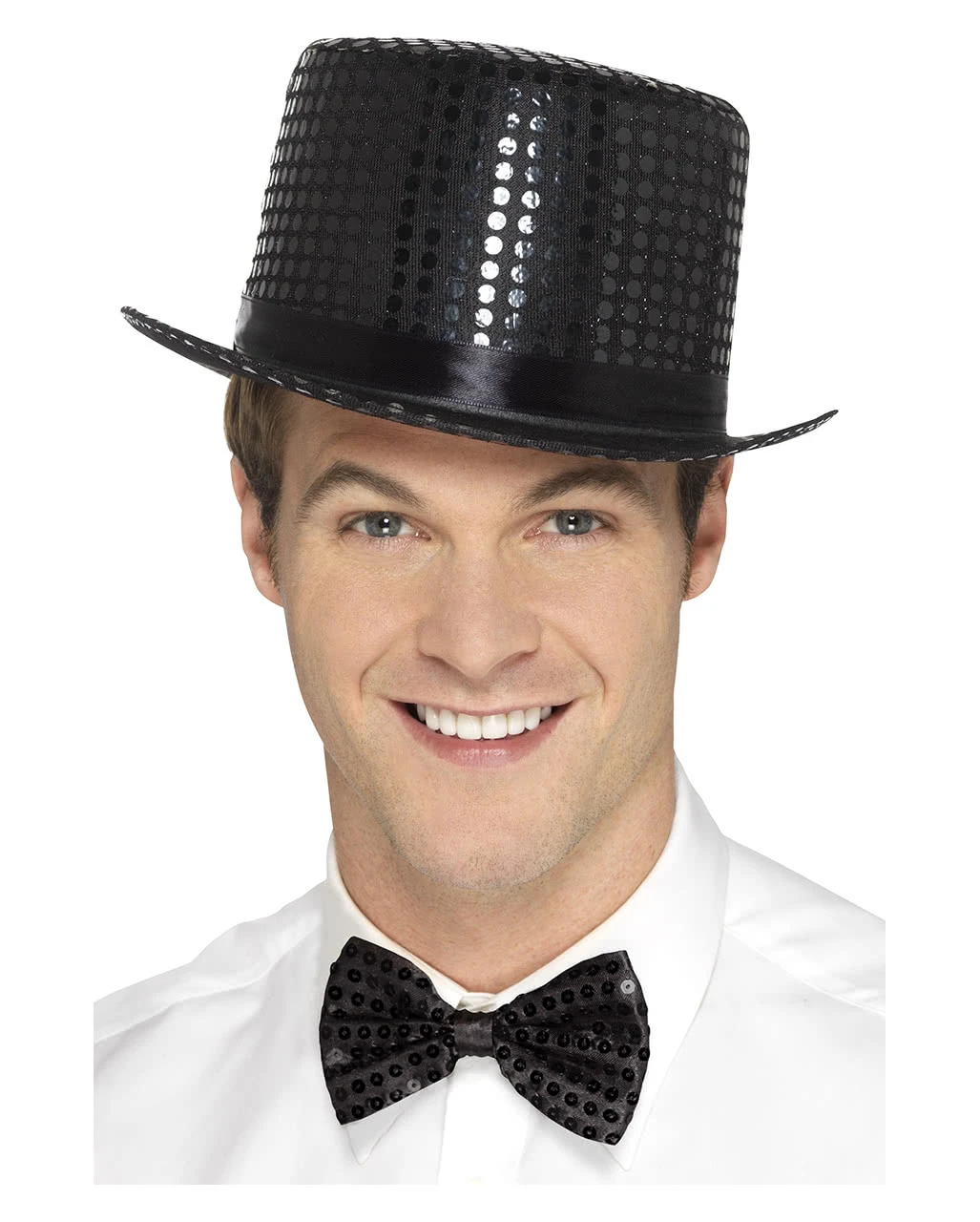 Der schwarze Pailletten Zylinder weist eine Höhe von ca. 12cm bei einem Umfang von ca. 62cm auf. Eine Vielzahl glänzender Pailletten sorgt dafür, dass der schwarze Magier-Hut bei Lichteinfall wunderbar glitzert. Ein Gummizug im Inneren des Halloween-Kostüm-Accessoires erhöht den Tragekomfort und verhindert Druckstellen. Ein schwarzes Hutband schmückt die Silvester-Kopfbedeckung zusätzlich. Dazu passen die Fliege Deluxe schwarz mit Pailetten und die Riesen Pailletten Krawatte schwarz.