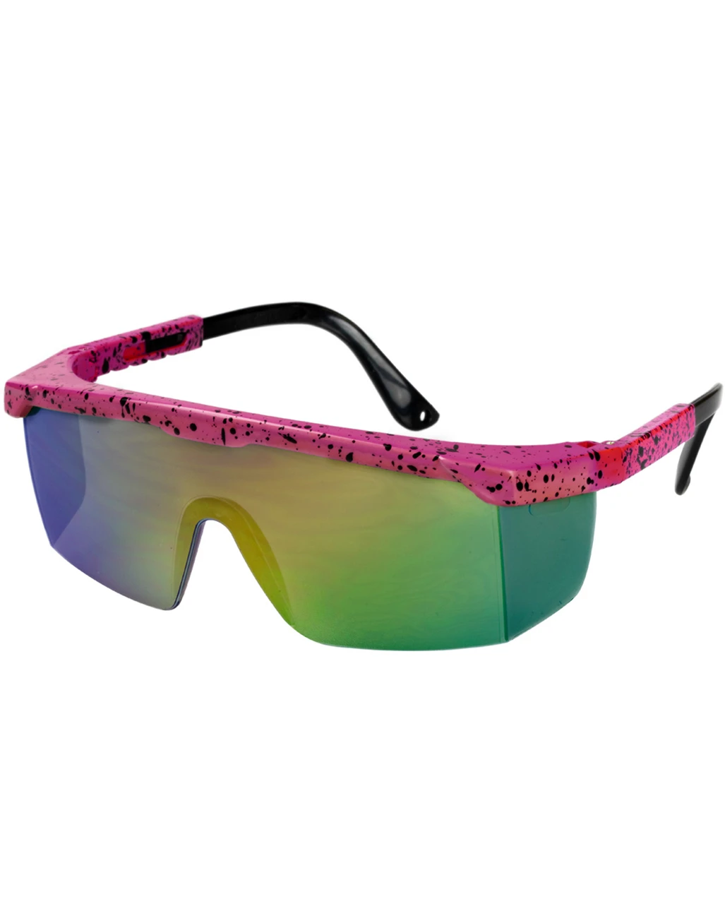 Neonpinke, verspiegelte Sonnenschutzbrille als 80ies Kostümaccessoire