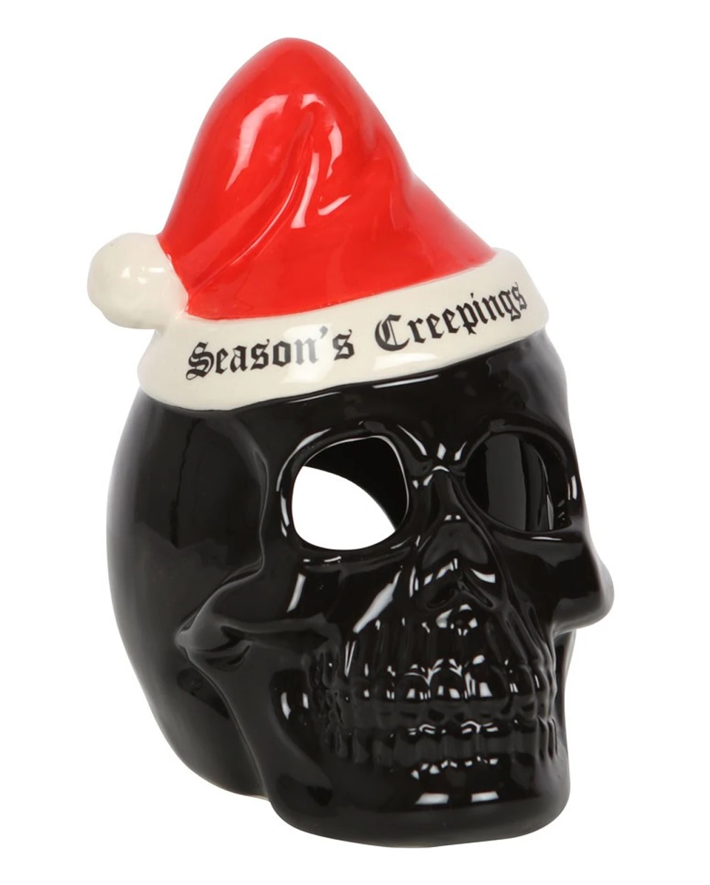 Der schwarzen Totenkopf mit einer „Season’s Creepings“-Santa-Mütze ist eine extravagante Gothic-Deko und zeigt das du als Totenkopf Fan trotzdem auf Weihnachten vorbereitet bist. Unser Totenschädel ist aus Keramik und ist Teil des Merry Cryptmas-Sortiments, das alternativen Weihnachtsgeschenke und Heimdekoration umfasst.