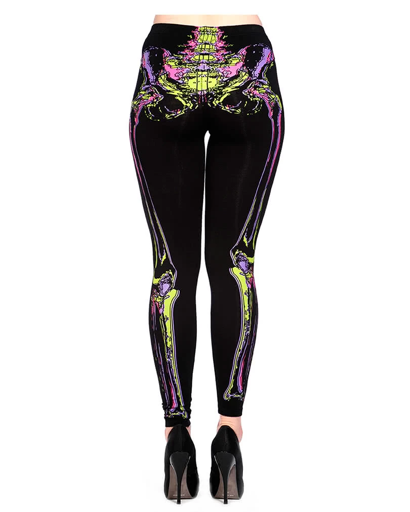 Die lässige Skelett Leggings ist schwarz und überzeugt durch den frechen Skelett Druck. Die grellen Farben in lila, grün und pink sind ein absoluter Eyecatcher. Die Damenhose ist dehnbar und hat einen elastischen Gummibund. Zu der Skelett Leggings kannst du das Cameo Top lila oder das Damenshirt Katze kombinieren.