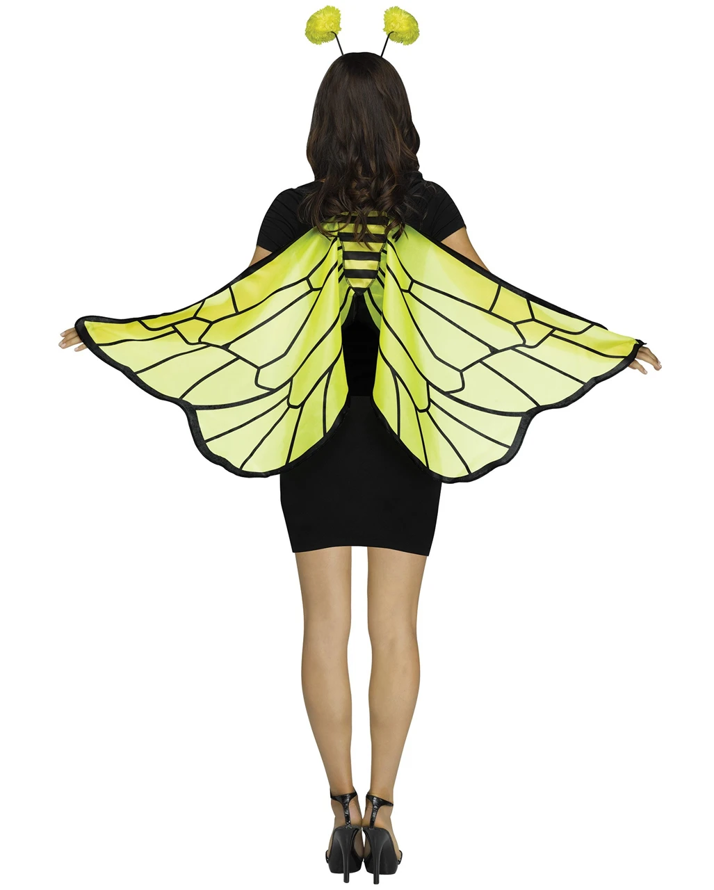 Das Kostüm enthält weiche Bienenflügel mit Fühler als lustiger Haarreif und mit dicken Bommeln als Antennen. Die Bienenflügel sind aus weichem Stoff gefertigt und auf den Außenseiten gelb mit schwarzen Linien. Zwischen den Flügeln befindet sich eine Verstärkung, an der zwei elastische Gummibänder angebracht sind, mit denen die Flügel leicht am Körper zu tragen sind. An den Außenkanten der Flügel ist rechts und links ein kleiner Fingerring angebracht, mit denen die Flügel an den Händen befestigt werden können. Durch diverse Armbewegungen lassen sich die Flügel dann problemlos öffnen und schließen. Im geöffneten Zustand haben die riesigen Kostümflügel eine Breite von ca. 160 cm. Der Aufdruck der Oberseite schimmert leicht durch, sodass die Farben an der Innenseite noch sichtbar sind. Entdecke auch unsere bezaubernden Riesige Schmetterlingsflügel blau