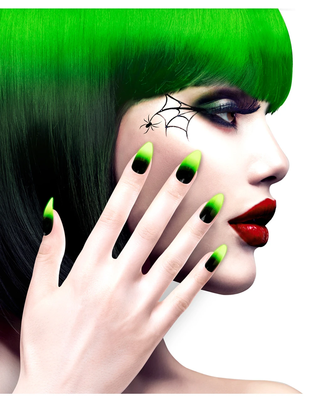 Ein elegantes Halloween Kostüm ist nur mit den passenden Fingernägeln komplett. Auf Horror-Shop.com findest du vielfältige Clip on Fingernägel für Walpurgisnacht, Fasching & Halloween. Ob zweifarbige Fingernägel, schrille 80er Jahre Neon Nägel oder edle Clip on Nägel. In unserem Sortiment ist für jeden Geschmack etwas dabei. Passend zu deiner gruseligen Hexen Verkleidung, sehen unsere Stileto Fingernägel Schwarz / Neongrün 12 St. absolut gefährlich aus! Mit diesen sexy Klauen wirst du zum echten Hingucker! Die Fingernägel grün-schwarz machen dich startklar für Halloween, Mottofeten & den beliebten Zombie Walk. Bestelle dir jetzt unsere Clip on Fingernägel für Halloween & Fasching und zeige allen deine sexy Krallen! Die spitzen Fingernägel für Horror Fans sorgen für das perfekte Grusel-Feeling und sind ein echter Blickfang für heiße Hexen-Ladys!