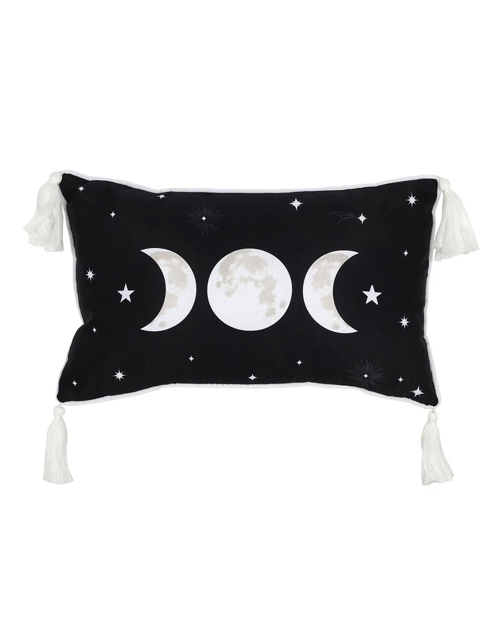 Dekoriere deine gemütliche Leseecke mit unserem Triadenmond Dekokissen. Das Wicca Wohnaccessoire präsentiert sich im schwarz-weißen Look und zeigt drei Monde in verschiedenen Phasen. Diese sind von einem mystischen Sternenhimmel umgeben. Dein rechteckiges Mondkissen ist ideal, um deine Gothic Kuschelecke aufzupeppen und macht sich auch als Geschenkidee hervorragend.